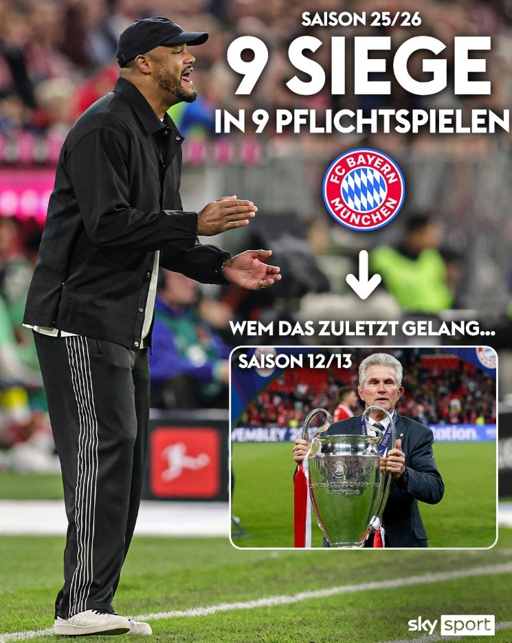 拜仁本赛季开局各项赛事豪取9连胜,球队前次作念到依然12/13赛季,那时海因克斯持教球队最终获取了德甲冠军、德国杯冠军和欧冠冠军,终赫然俱乐部历史上的初次三冠王大业。