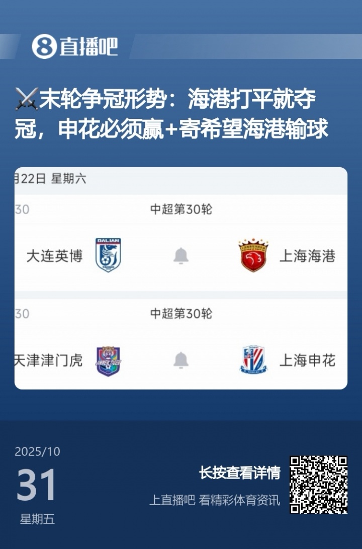 本赛季海港逾越申花2分,末轮只需要打平就夺冠。