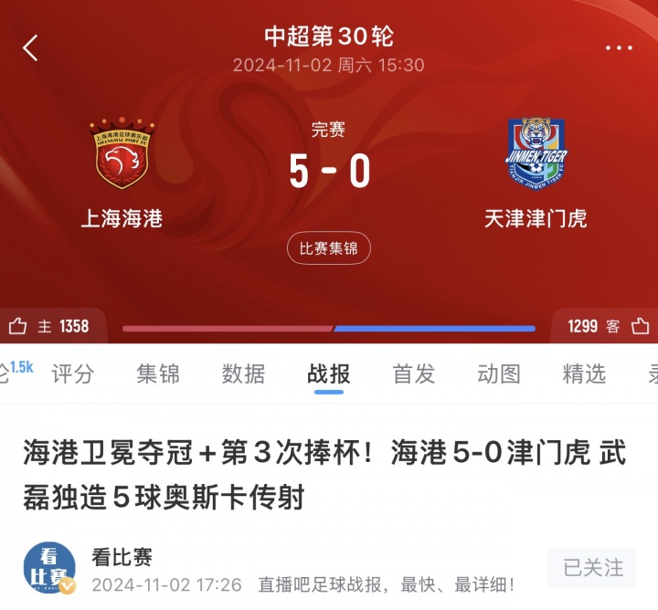 如出一辙!客岁第29轮海港逾越申花1分,最终海港5-0津门虎夺冠