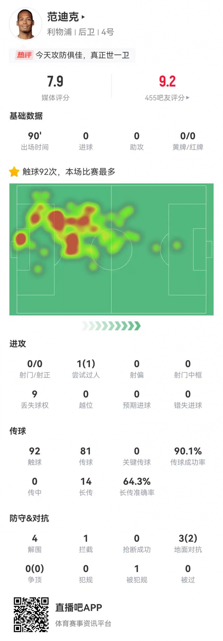 世几卫?范迪克4突围3封堵1禁锢0被过0犯规 14长传9得胜 获7.9分