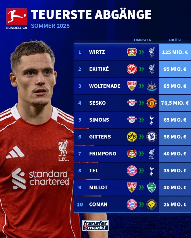 9月4日讯 德甲夏窗也曾为止,《转会市集》也统计了德甲今夏的最贵卖东说念主榜,维尔茨断崖领跑。