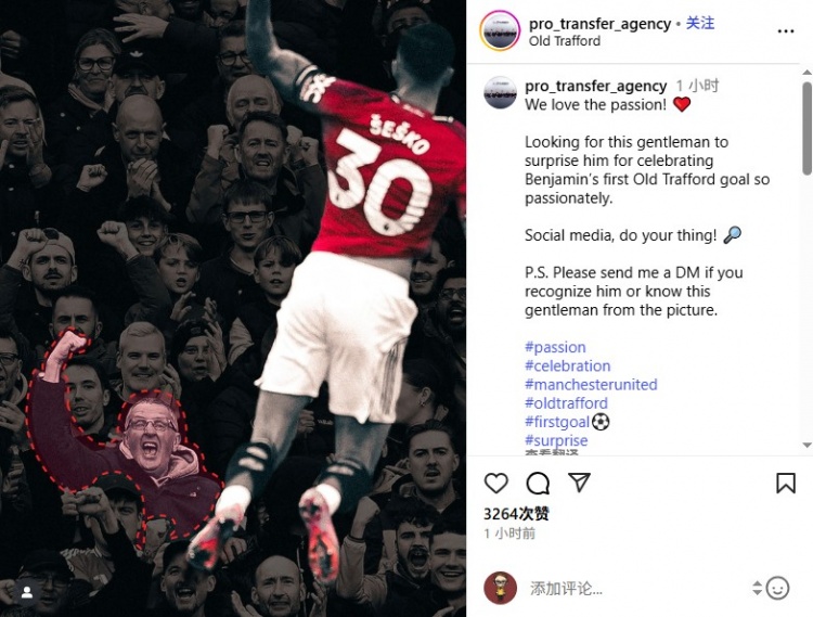 舍什科的经纪公司Pro Transfer Agency晒出这位球迷的像片,并写谈:“咱们爱这份情感!正在寻找这位先生,念念给他个惊喜,因为他为舍什科的老特拉福德首球进行了如斯关切的庆祝。”