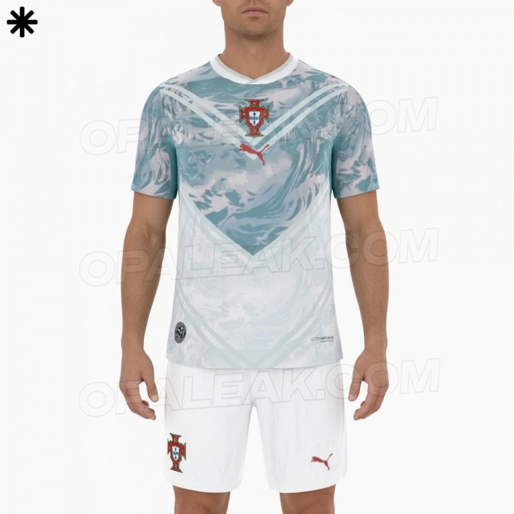 这件葡萄牙2026年宇宙杯客场球衣以海蓝色(aquamarine)为主色彩,在球衣上半身加入了图案野心。胸部和腹部的V字形和会了不同浅深的海蓝色和白色,球队队徽以及品牌logo位于正中间。