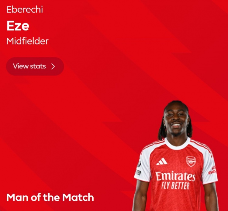 毫无悬念!英超官方:演出帽子戏法的埃泽当选阿森纳vs热刺MVP