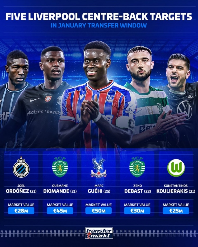 11月25日讯 利物浦在本赛季进展高开低走,瞻望将在冬窗补强中卫位置,《转会市集》也列出了他们的五大潜在绸缪及德回身价: