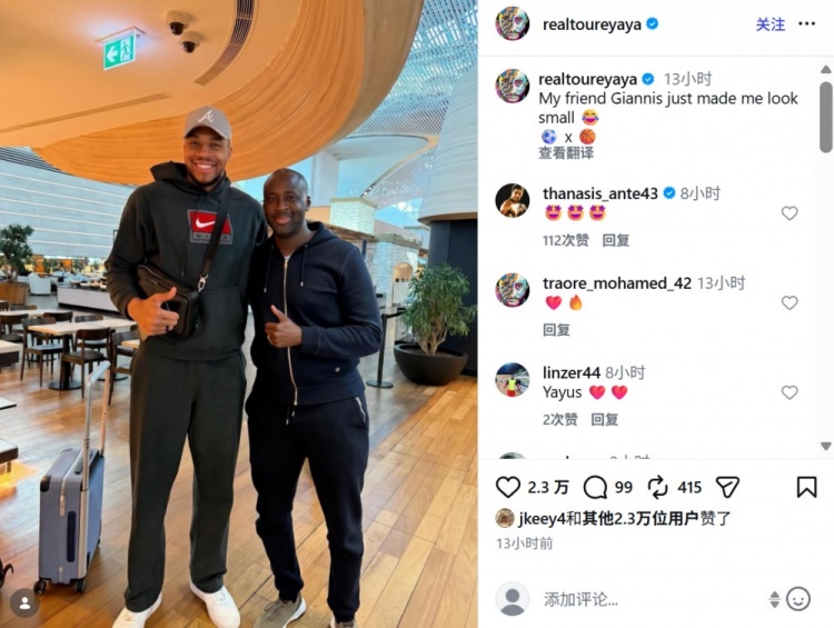 亚亚·图雷社媒晒与NBA字母哥合照,调侃道:我看起来好小只