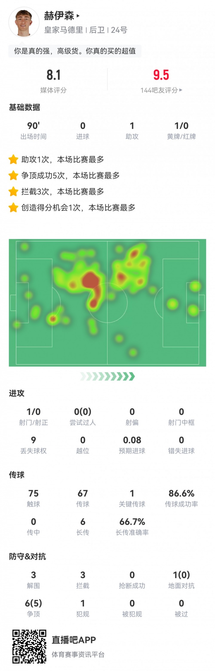 真高档货!赫伊森数据:1助攻1要津传球3突围3禁绝,评分8.1