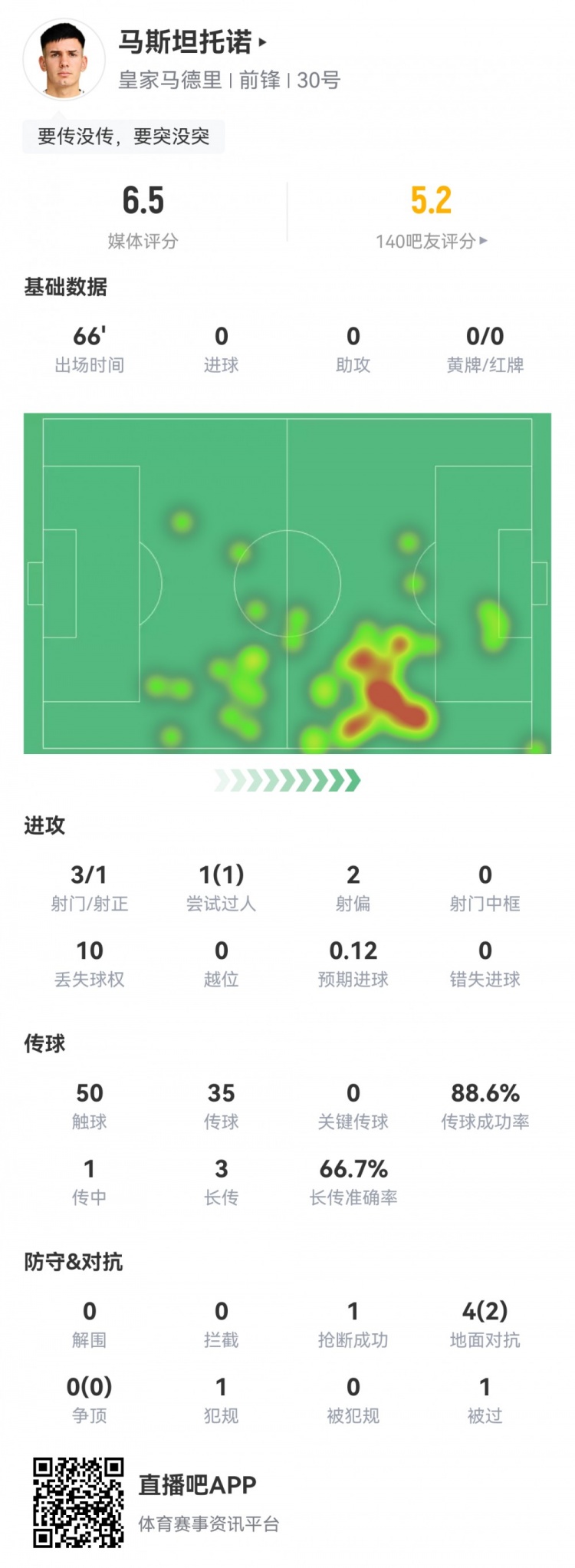 还要稳妥!马斯坦托诺数据:3射1正1过东谈主1关节传球,评分仅6.5