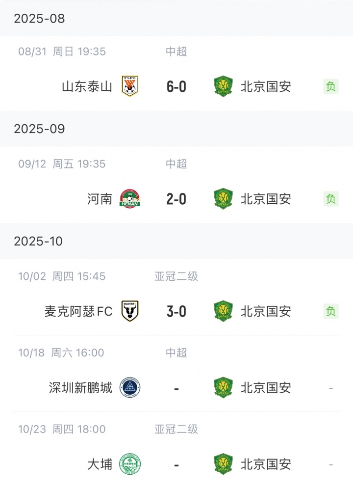 国安往日客场赛程:10.18对阵新鹏城、10.23对阵大埔、11.01对阵亚泰