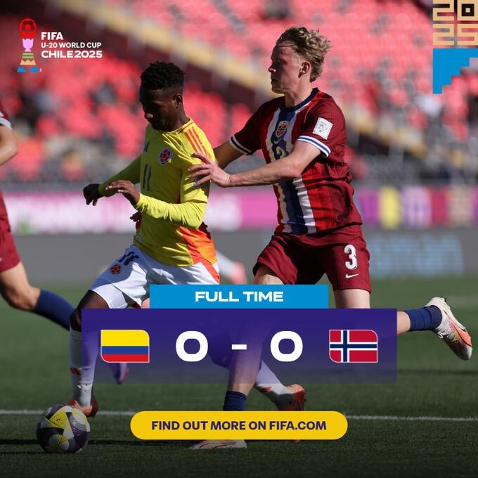 世青赛:哥伦比亚U20以0-0战平挪威U20,单队18次射门未得回进球