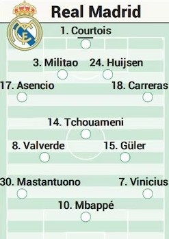 阿斯筹商皇马首发:库尔图瓦、米利唐、赫伊森 、劳尔-阿森西奥、卡雷拉斯、琼阿梅尼、巴尔韦德、居勒尔、马斯坦托诺、维尼修斯 、姆巴佩
