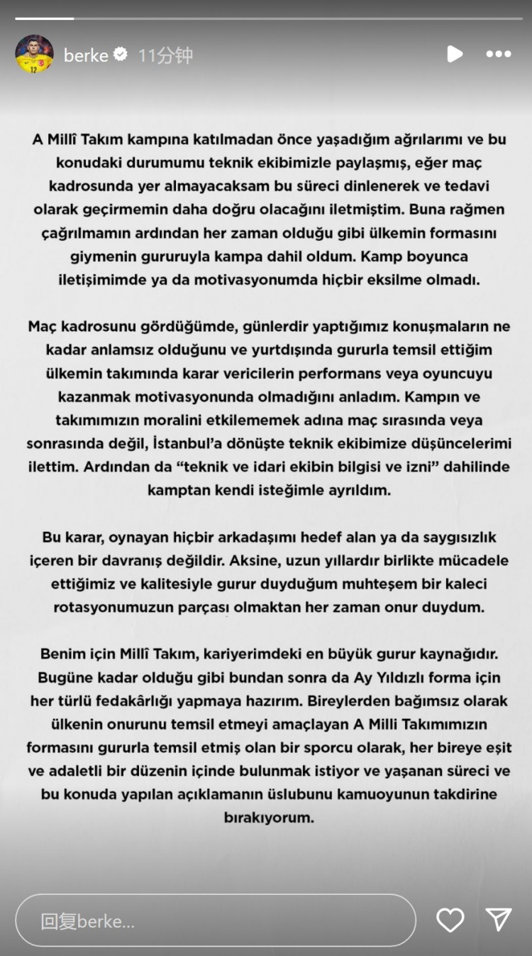 当看到比赛名单时,我才刚烈到这些天来的换取毫无真谛——那些在国际为国争脸的球员,在国度队方案者眼中,其领悟和斗志根底不被爱重。为幸免影响集训营和球队士气,我汲取在复返伊斯坦布此后向本领团队传达了我的念念法,而非在比赛时代或赛后,随后在‘本领和处罚团队知情并痛快’的情况下,我自发离开了集训营。