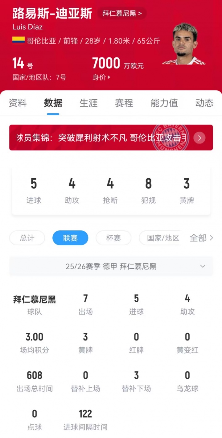 而夏窗总价7500万欧元离开利物浦,加盟拜仁的迪亚斯在更换环境后,仍保握着火热的情景。他现在为拜仁在德甲出战7场比赛,孝顺5球4助,共平直参与球队9个进球。除了紧迫端的进展,迪亚斯驻扎时的积极性也取得了拜仁球迷的好评。