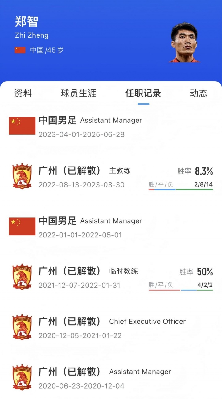 2021年12月7日,郑智出任广州队膨胀主培植兼球员。2022年1月,41岁的郑智出战广州队vs长春亚泰的中超比赛,这是他作事生存终末一次出场。2022年8月,郑智出任广州队主培植。 2023年2月27日,郑智出任国足助教 。跟着伊万离任,郑智也退放洋足助教团队。