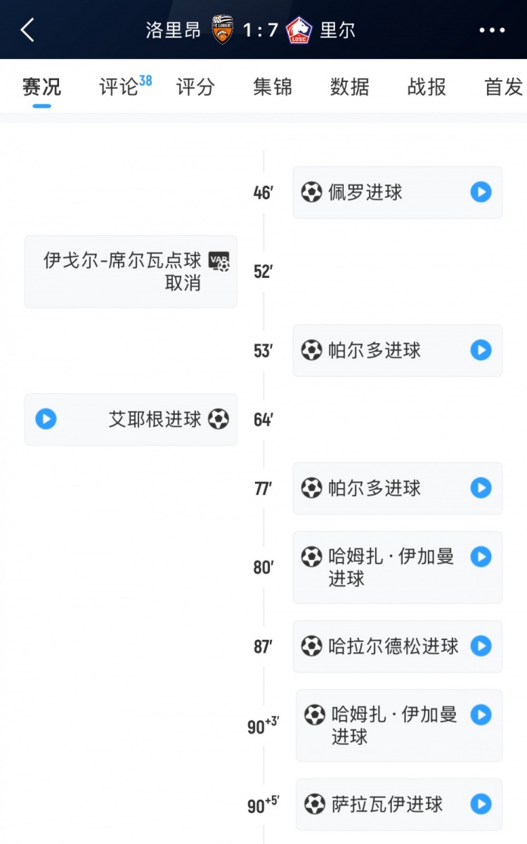 7-1客胜洛里昂&下半场打入沿路7球,里尔是法甲自1997年来首队