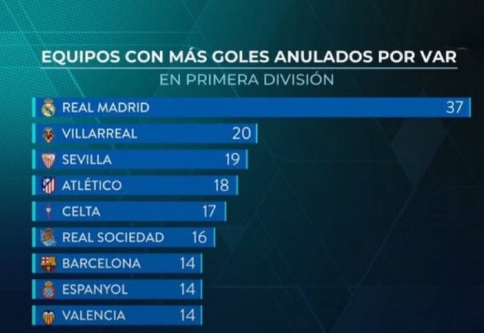 赛后皇马官方电台晒出图标,统计西甲被VAR取消的进球排行,其中皇马有37球被VAR取消,大幅超越排行第二的比利亚雷亚尔。