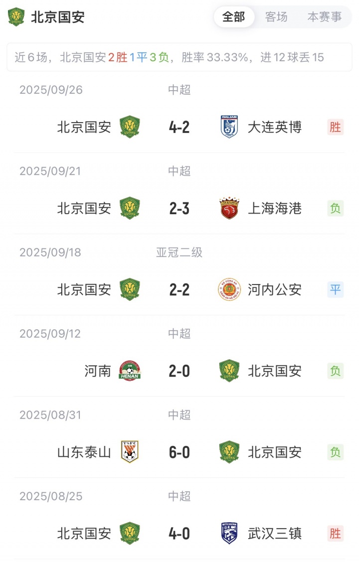 国安与麦克阿瑟此前还未交手过,两边近6场比赛战绩如下: