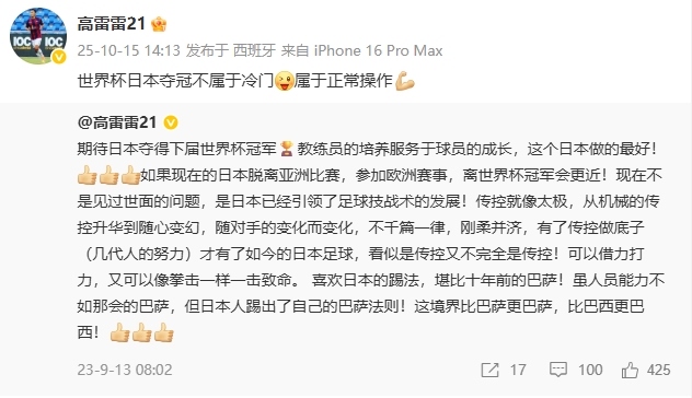 高雷雷转发了我方两年前谈日本足球的言论,并写谈:“天下杯日本夺冠不属于冷门,属于平常操作💪”