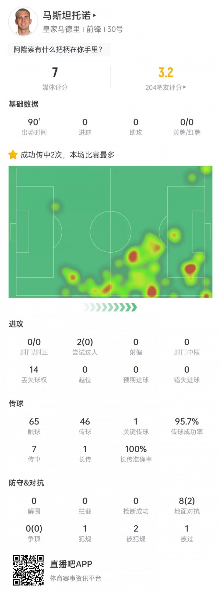 马斯坦托诺本场数据:射门过东说念主挂零,8次回击2次得胜,获评7分