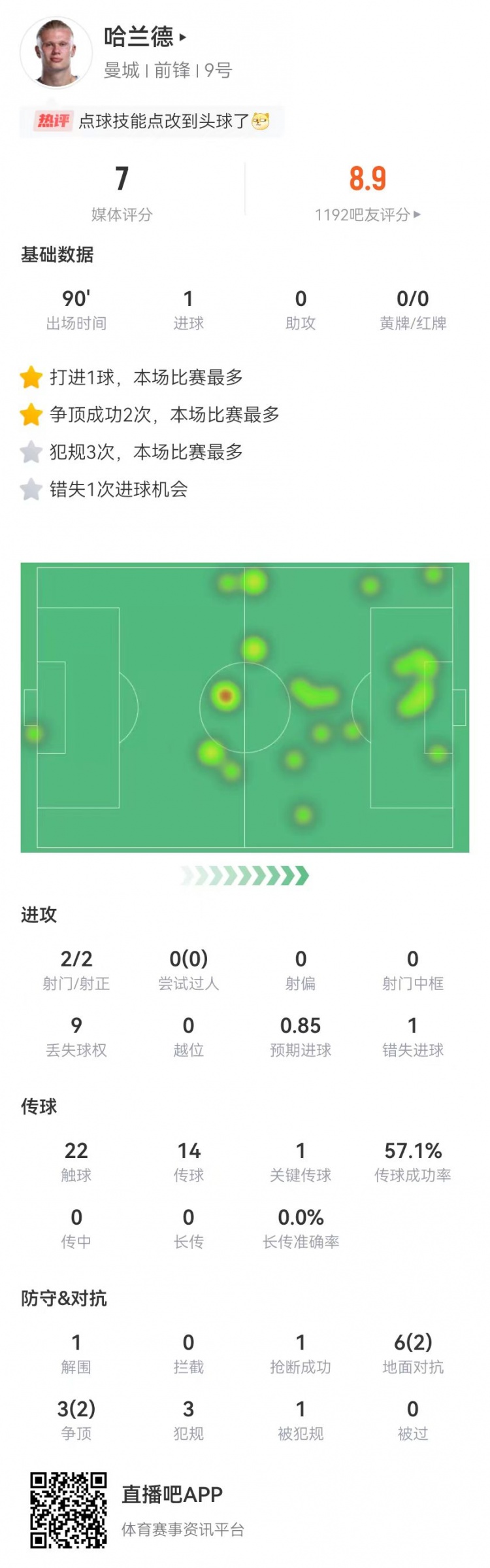 哈兰德本场2射2正进1球+1失点 9抗拒5奏效+3犯规 获评7分