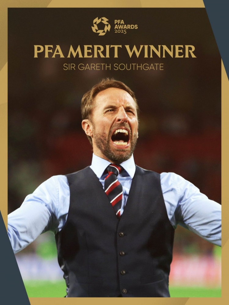 PFA社媒晒出海报,说明前英格兰主帅索斯盖特荣获2025年PFA超卓孝敬奖,他将在今晚的受奖仪式中因对英格兰足球的凸起孝敬而受到犒赏。