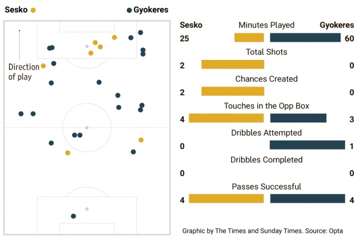 08月19日讯 英超首轮阿森纳客场1-0曼联,约克雷斯和塞斯科各自献艺了个东谈主的英超首秀,泰晤士报承接OPTA统计了二东谈主的数据。