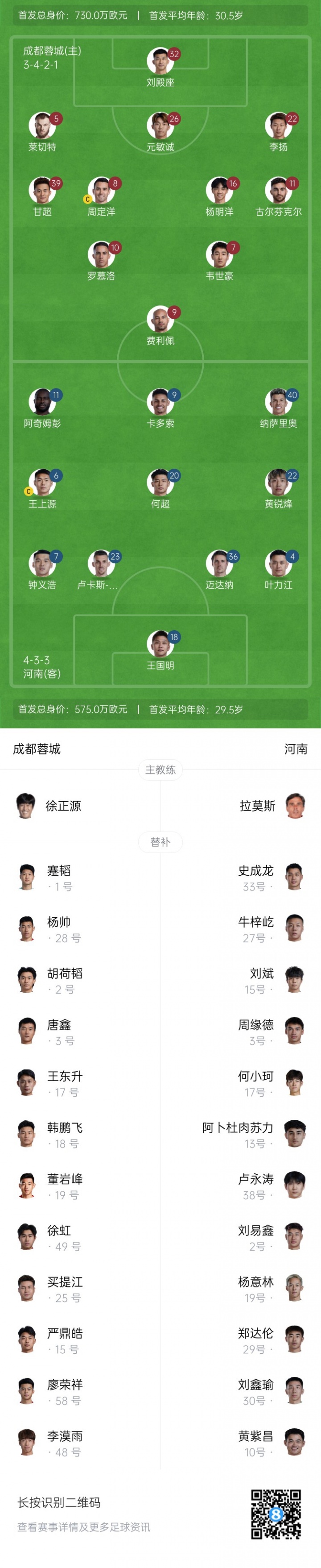 足协杯-蓉城vs河南首发:韦世豪、杨明洋先发,何超、王上源出战