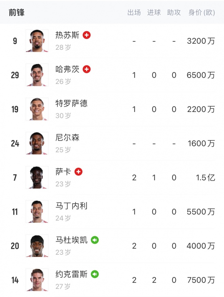 阿森纳中前场声势情况↓