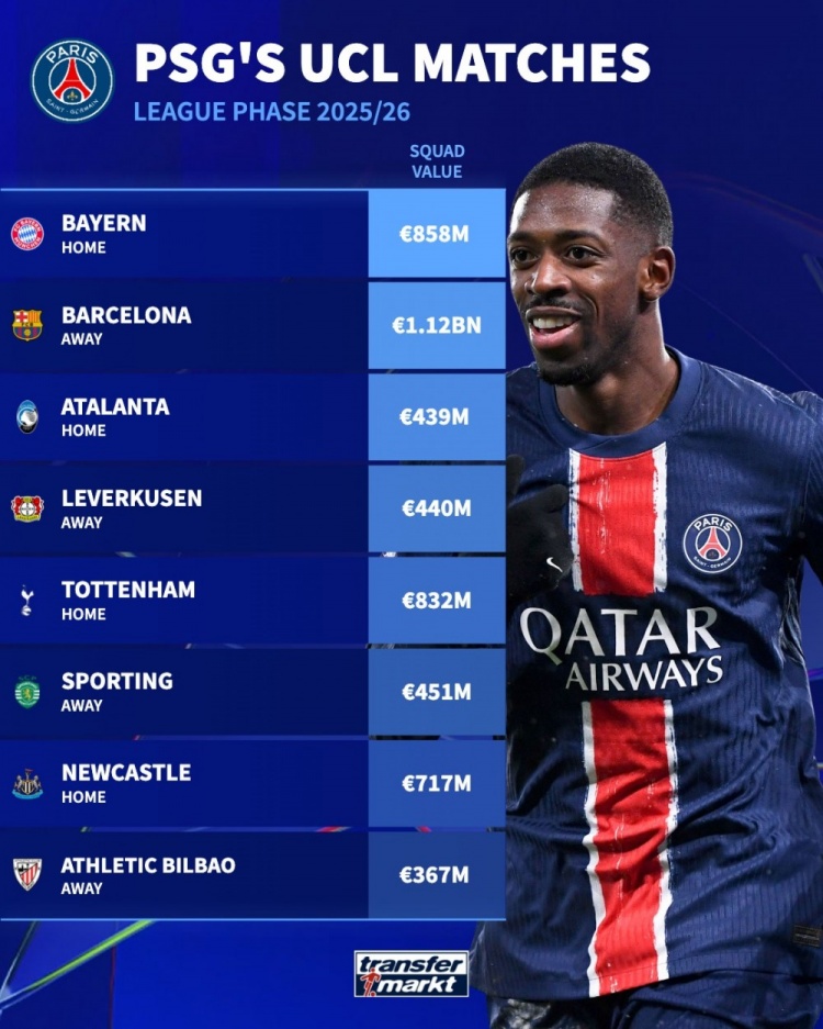 8月29日讯 本赛季欧冠联赛阶段对阵抽签效劳出炉,德国转会阛阓清点了巴黎敌手的身价。