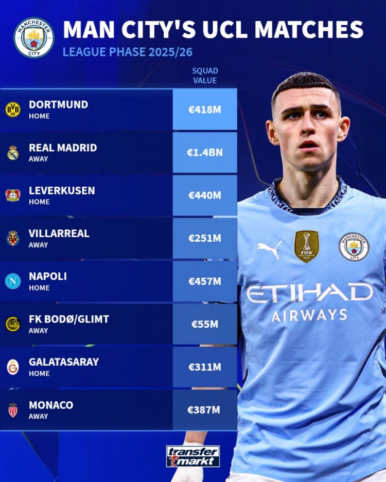 8月29日讯 本赛季欧冠联赛阶段对阵抽签服从出炉,德国转会市集清点了曼城敌手的身价。