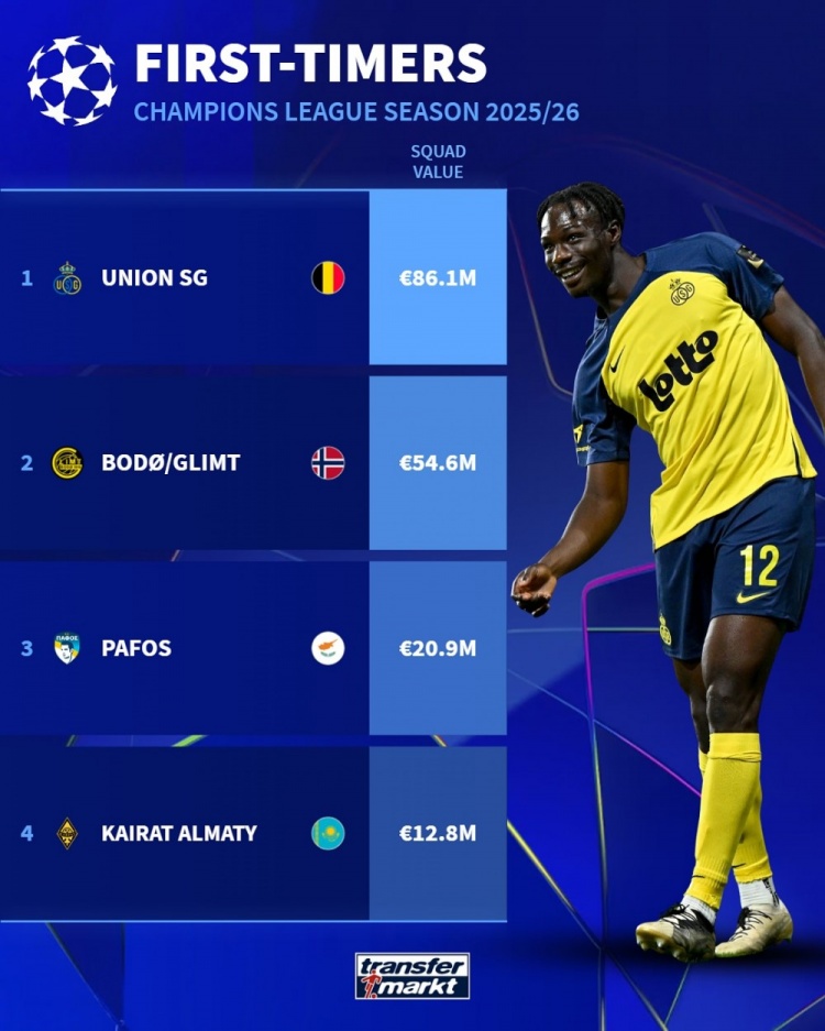 欧冠新军球员总身价名次: