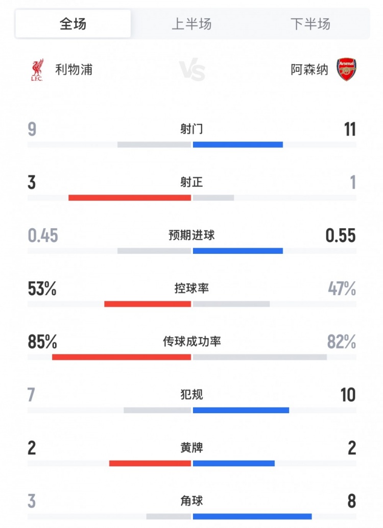 利物浦1-0阿森纳全场数据:射门9-11,射正3-1,控球率53%-47%
