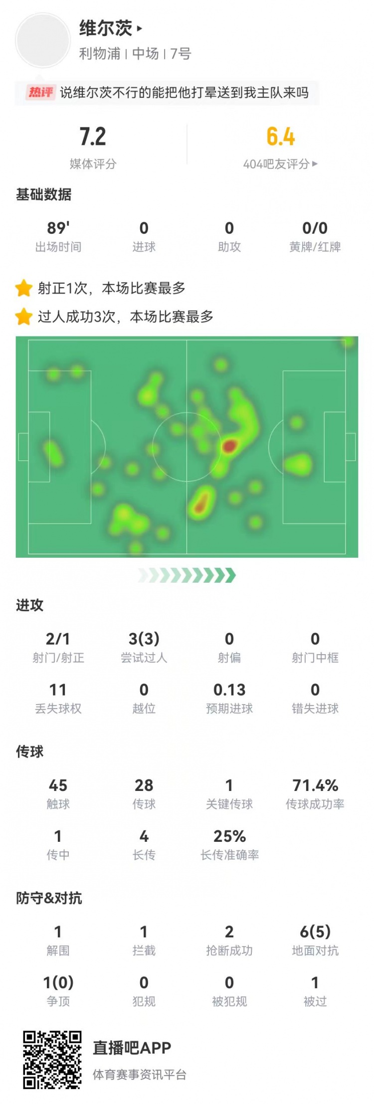 维尔茨本场2射1正+1枢纽传球 3过东谈主3得手+7抗拒5得手 获评7.2分