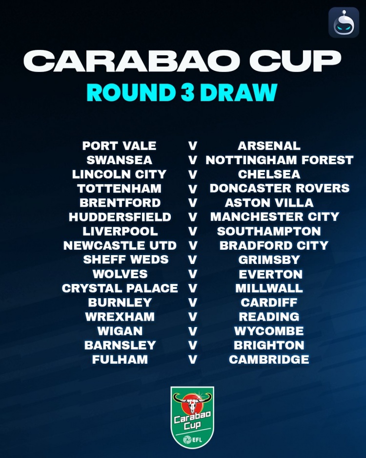 8月28日讯 英格兰联赛杯第三轮抽签成果揭晓,具体如下: