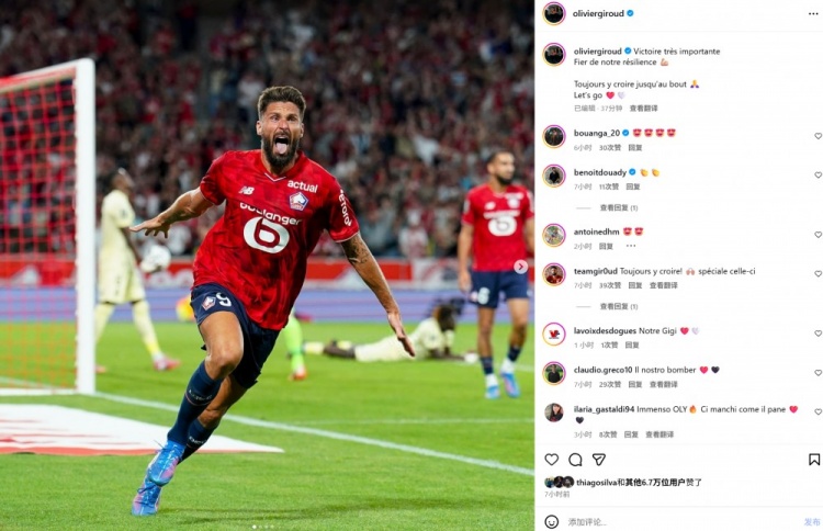 8月25日讯 在本轮法甲,里尔1-0打败摩纳哥,38岁吉鲁献技补时绝杀,连结两轮进球。