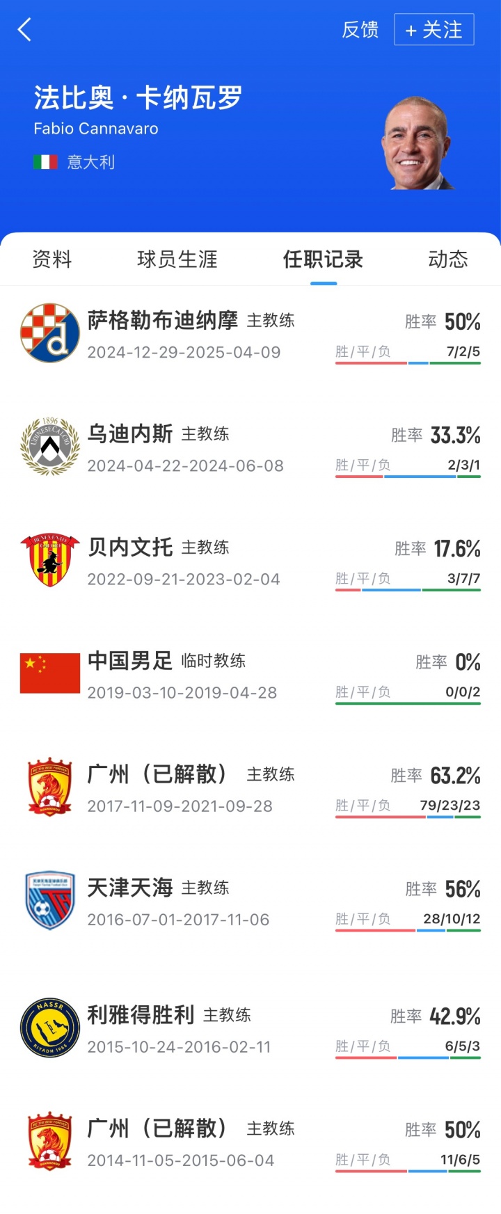 卡纳瓦罗现年51岁,曾执教广州恒大、利雅得得胜、天津权健、贝内文托、乌迪内斯和萨格勒布迪纳摩。2019年3月-4月,卡纳瓦罗曾出任国足临时主帅,带队设置中国杯,2场比赛均以0-1的比分不敌乌兹别克斯坦和泰国队。