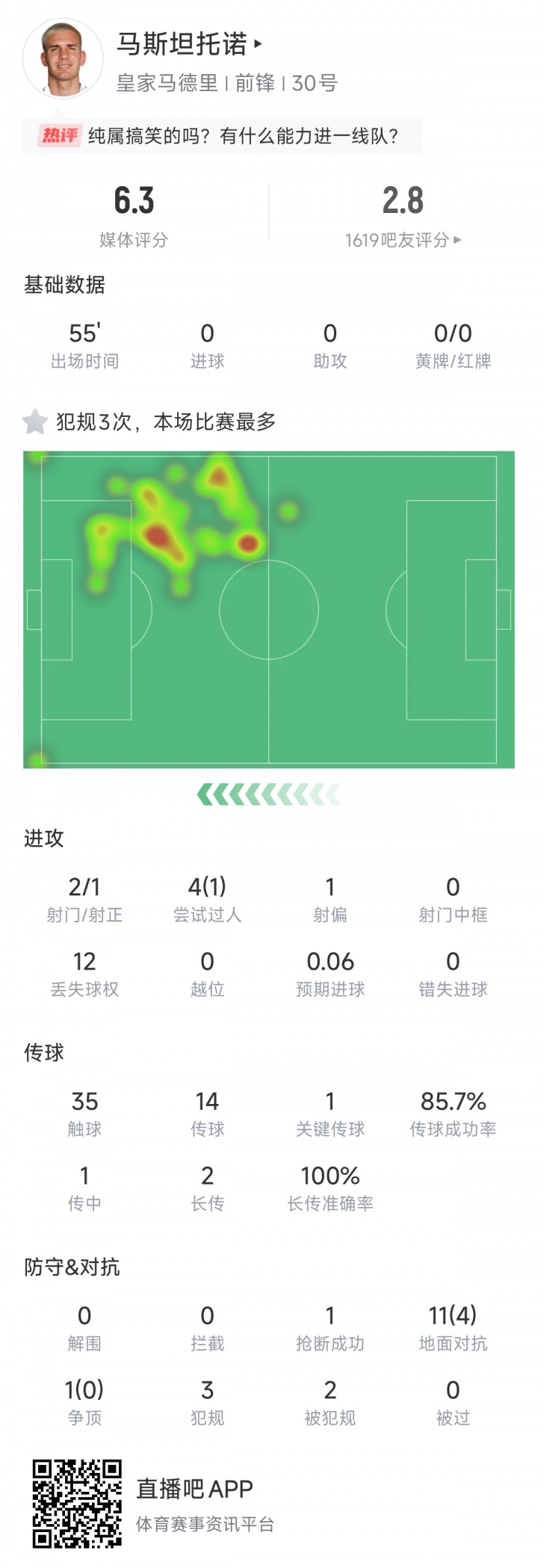 本场比跑马斯坦托诺说明欠安,遭到球迷吐槽。赛中他还屡次滑倒,起义也不占上风,最终机构评分仅6.3分,吧友评分仅2.8分。