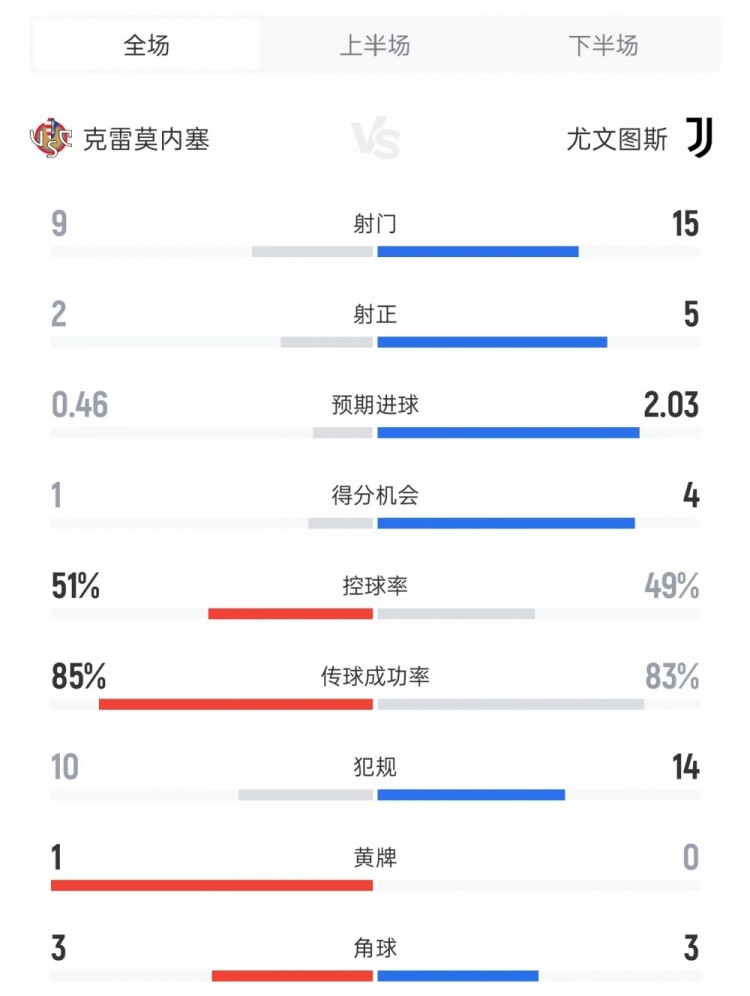 尤文vs克雷莫内塞数据:射门15比9、射正5比2、控球率49%比51%