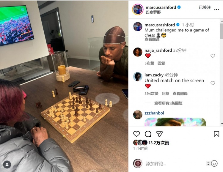 拉什福德社媒晒出对弈相片,配文:“姆妈向我发起了海外象棋挑战。”