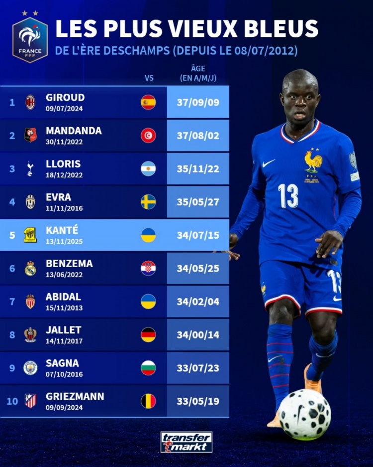 11月15日讯 世初赛欧洲区比赛,坎特踢满全场,匡助法国主场4-0打败乌克兰,德转列出了德尚捏教法国队以来年岁最大出场球员排行,吉鲁居首,坎特排在第5位。