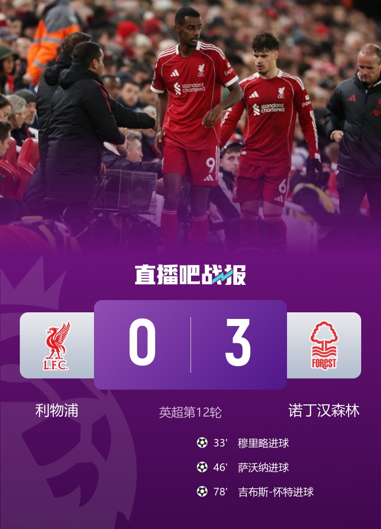 英超第12轮,利物浦主场0-3不敌诺丁汉丛林,近7轮比赛吞下6场失利,联赛积分榜上也曾跌至第11名。