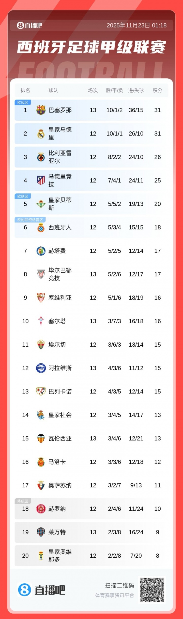 西甲最新积分榜:巴萨本轮大捷后暂升榜首,皇马行将客战埃尔切。