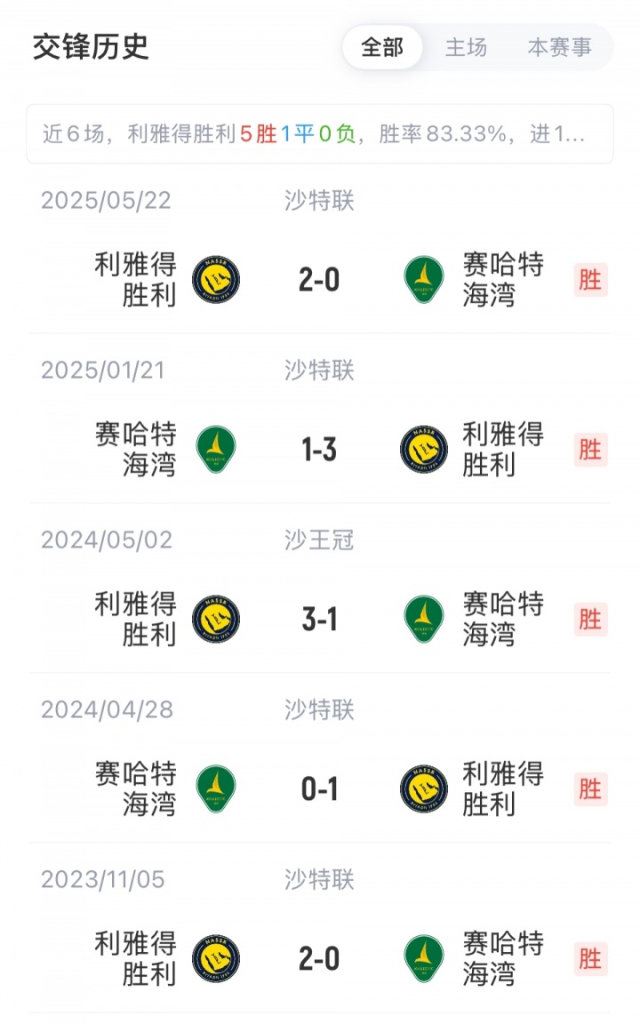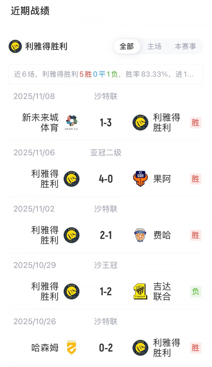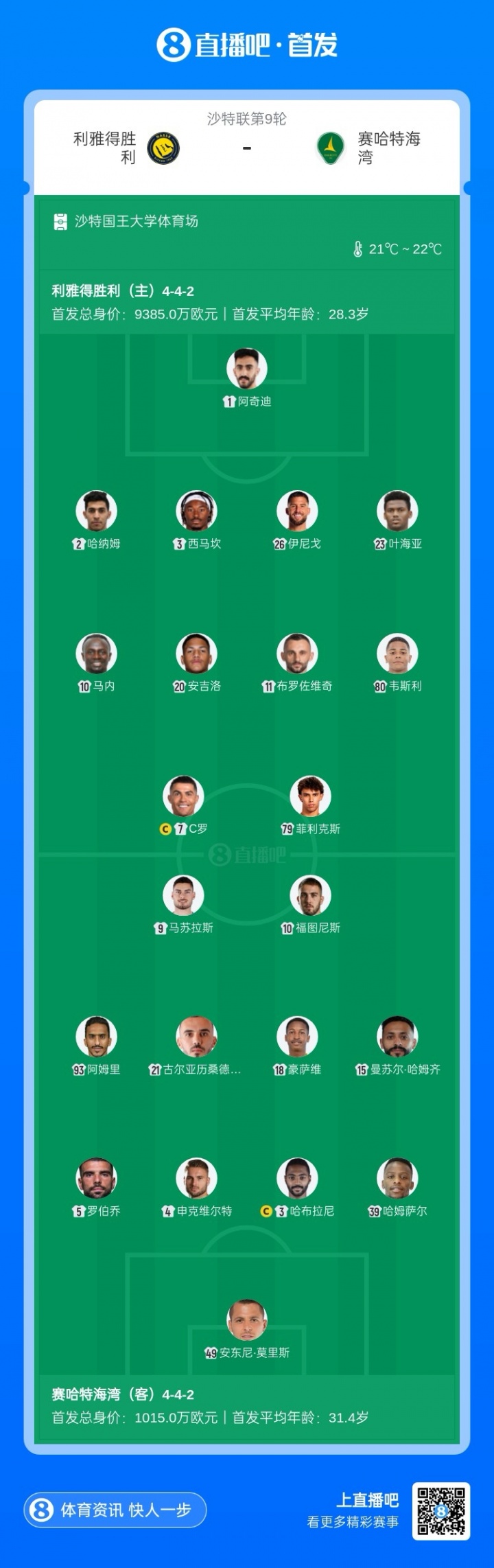 利雅赢得手首发:1-阿奇迪、2-哈纳姆、3-西马坎、26-伊尼戈·马丁内斯、23-叶海亚、11-布罗佐维奇、20-安吉洛、79-菲利克斯、80-韦斯利、10-马内、7-C罗
