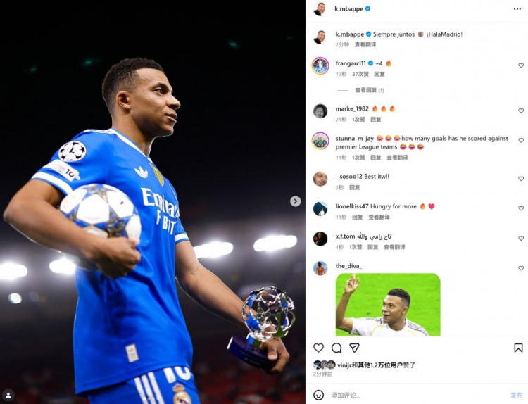 本场比赛姆巴佩演出大四喜,赛后他也在社媒晒出拿走比赛用球和全场最好奖杯的相片,配文写谈:“长期合营一致,皇马加油!”