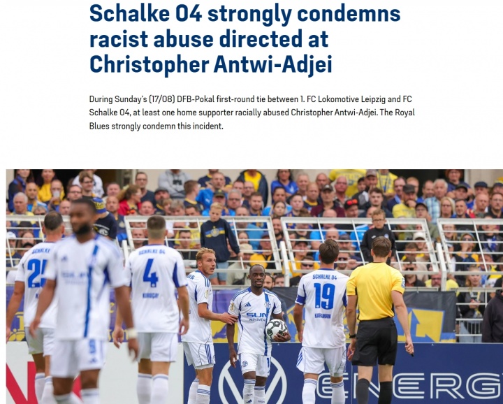 08月19日讯 德国杯首轮,沙尔克04客场1-0打败地区联赛球队莱比锡火车头,沙尔克球员阿杰伊赛后暗示,我方遭到了现场球迷的种族敌视。