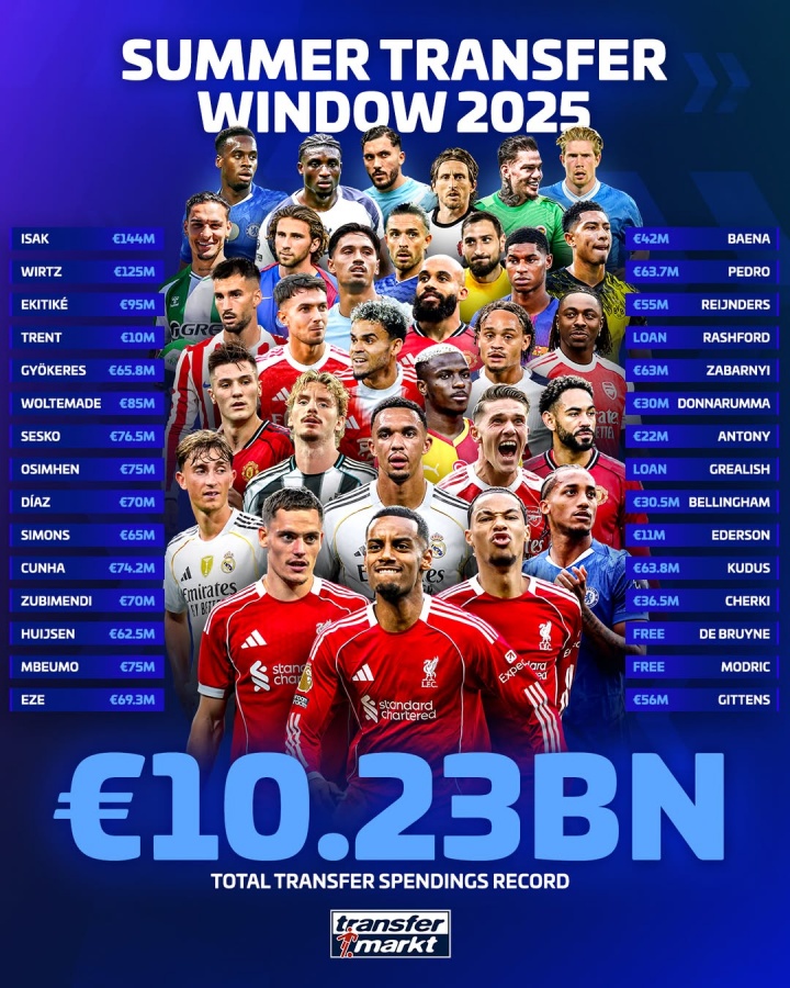 这个金额是足坛单个转会窗历史最高,一个世纪级窗口!
